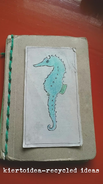 Kansi olisi varmaankin kannattanut tehdä jostakin vähän vahvemmasta materiaalista, sillä se on aika lailla rähjääntynyt reissussa. Onneksi tuo merihevosen kuva on säilynyt kohtuullisen hyvänä ja sen voi käyttää vielä jossain toisessa työssä. Ajattelin vielä tehdä uutta paperia kalenterin sivuista, se on nimittäin vahvaa taiteilijatarvikeliikkeestä ostettua plaatua, olisikohan tuo ollut Canson-paperia.